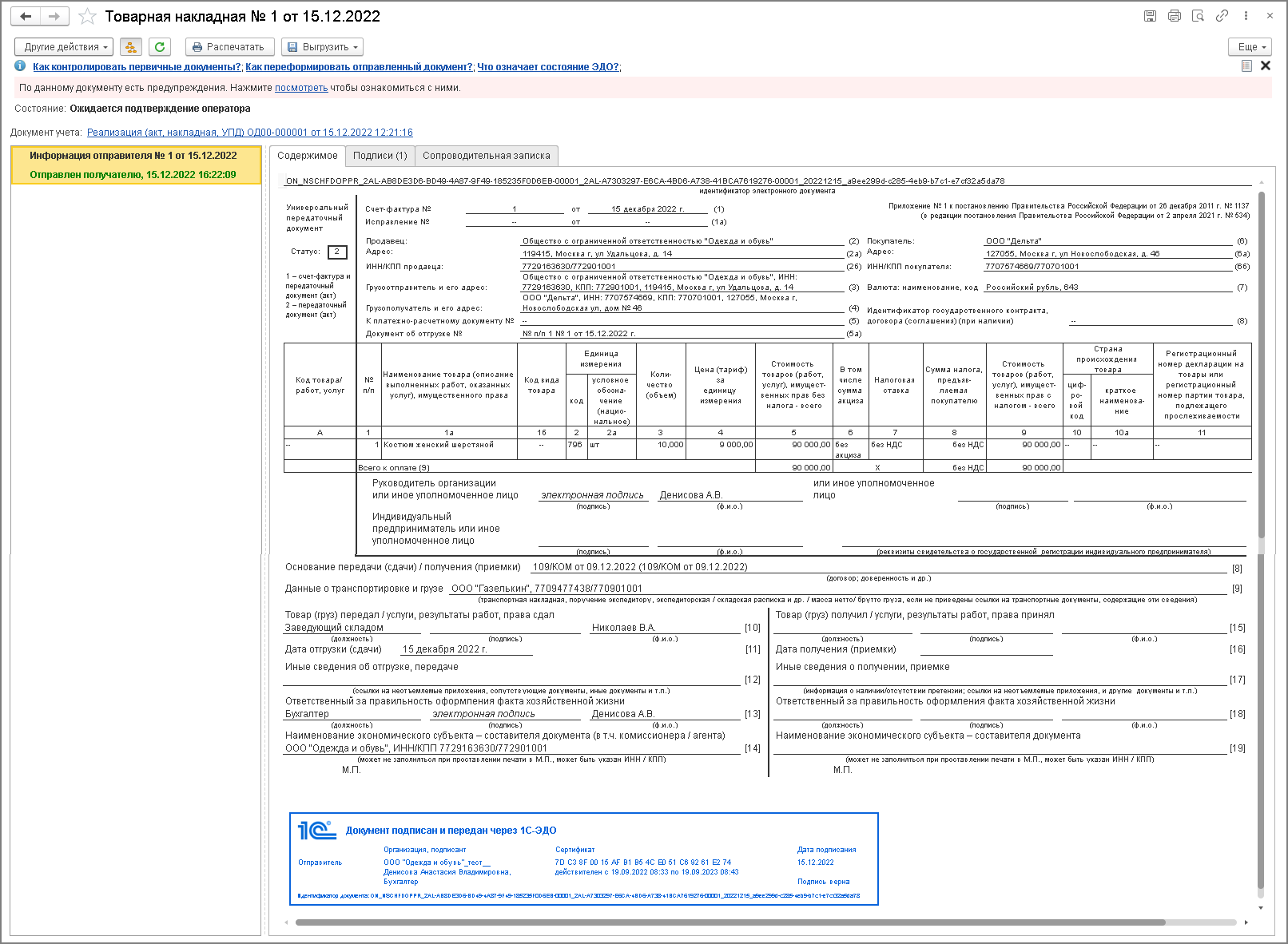 После отправки электронного УПД(ДОП) на соответствующих закладках формы просмотра можно получить информацию о состоянии обмена всеми документами, сопровождающих обмен данным УПД(ДОП), о подписях и статусах электронного документа, а также ознакомиться с сопроводительной запиской при ее наличии (рис. 15).