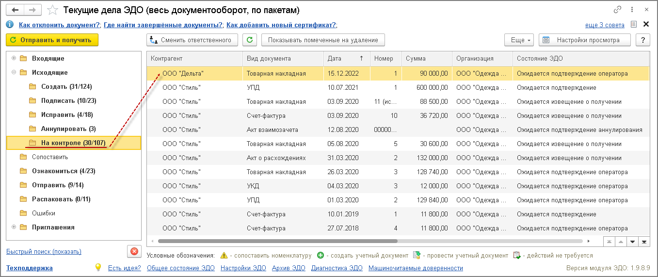Отправленный УПД(ДОП), в отношении которого ожидается получение перечисленных документов, перекладывается в папку документов "На контроле" формы списка документов "Текущие дела ЭДО" (рис. 16).