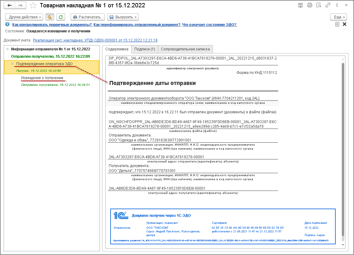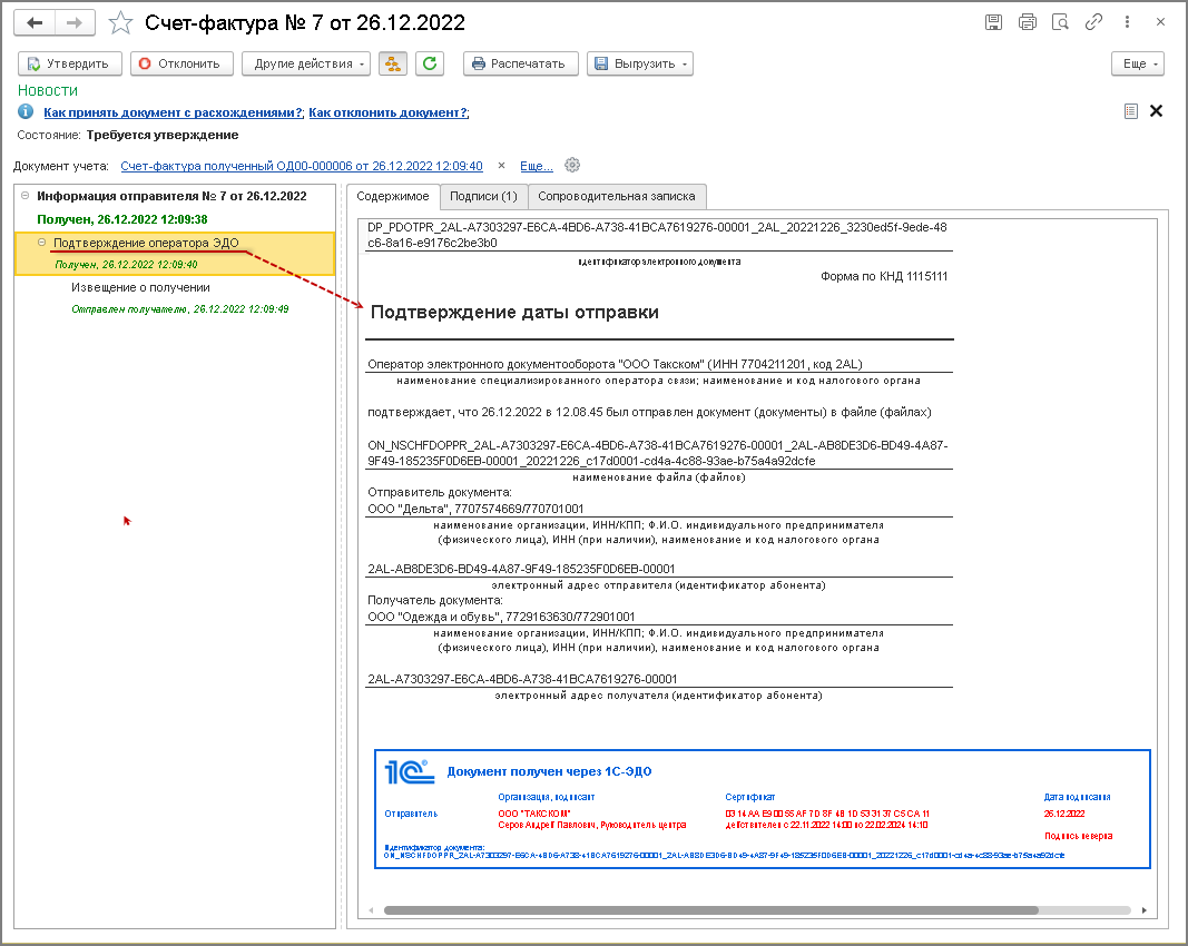 Дата направления, указанная в этом подтверждении оператора ЭДО (рис. 10), будет признаваться датой получения счета-фактуры комитентом (п. 1.11 Порядка обмена).