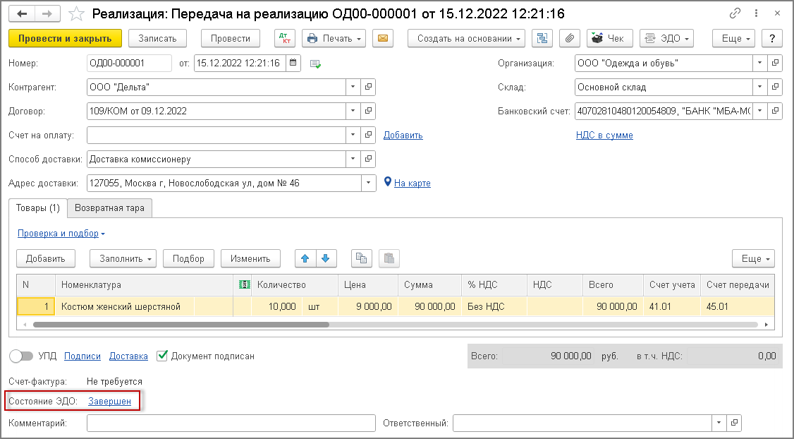 После завершения обмена электронным документом на передачу товаров на реализацию комитентом комиссионеру в документе учетной системы "Реализация (акт, накладная, УПД)" в информационной строке состояния электронного обмена "Состояние ЭДО" отражается гиперссылка Завершен (рис. 20).