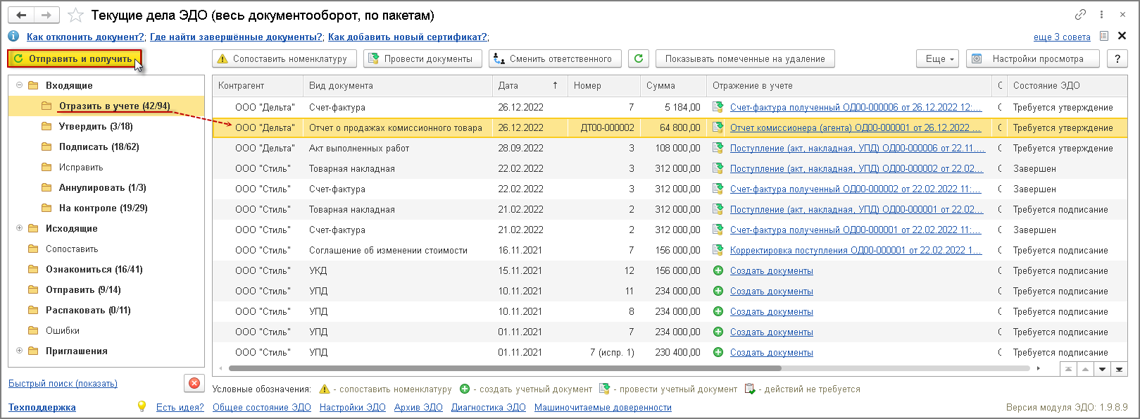 - по кнопке Отправить и получить из списка "Текущие дела ЭДО" (рис. 16);