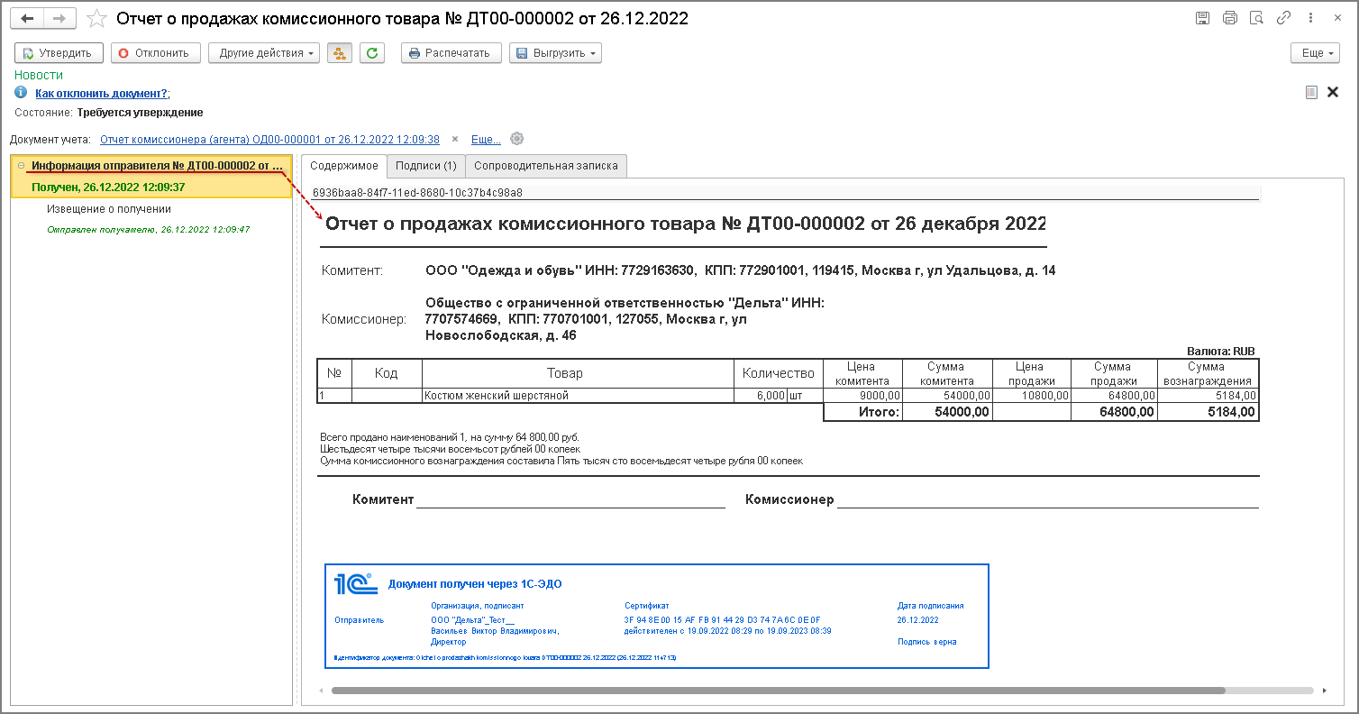 При отсутствии возражений комитент должен утвердить электронный документ "Отчет о продажа комиссионного товара" по кнопке Утвердить:
