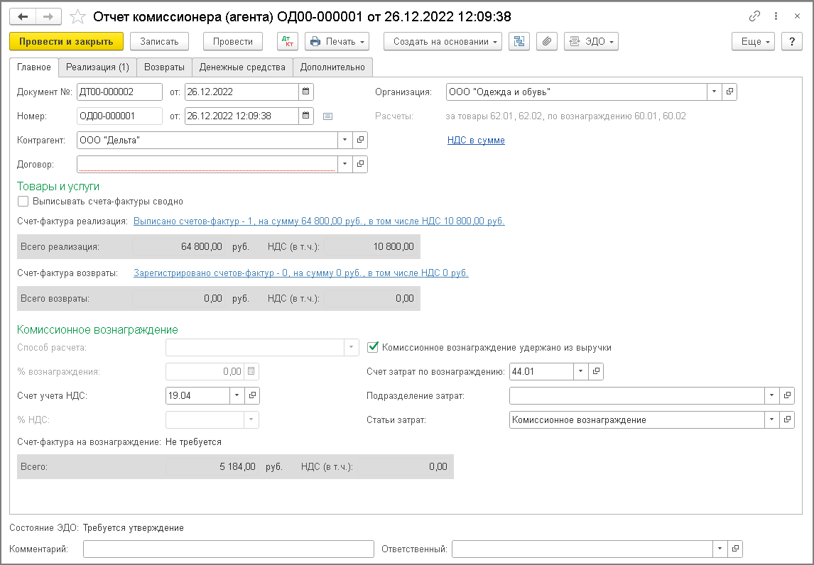Организация ООО «Одежда и обувь» (комитент) заключило с ООО «Дельта» (комиссионер) договор комиссии, по которому комиссионер за вознаграждение реализует покупателям товары комитента. По условиям договора комиссионер реализует товары по ценам, не ниже цен, указанных в накладной на передачу товаров, и участвует в расчетах. Вознаграждение комиссионера составляет 8% от выручки за реализованные товары и удерживается из денежных средств, полученных от покупателей. Дополнительная выгода принадлежит комитенту. Стороны также заключили соглашение об обмене электронными документами (в том числе счетами-фактурами).