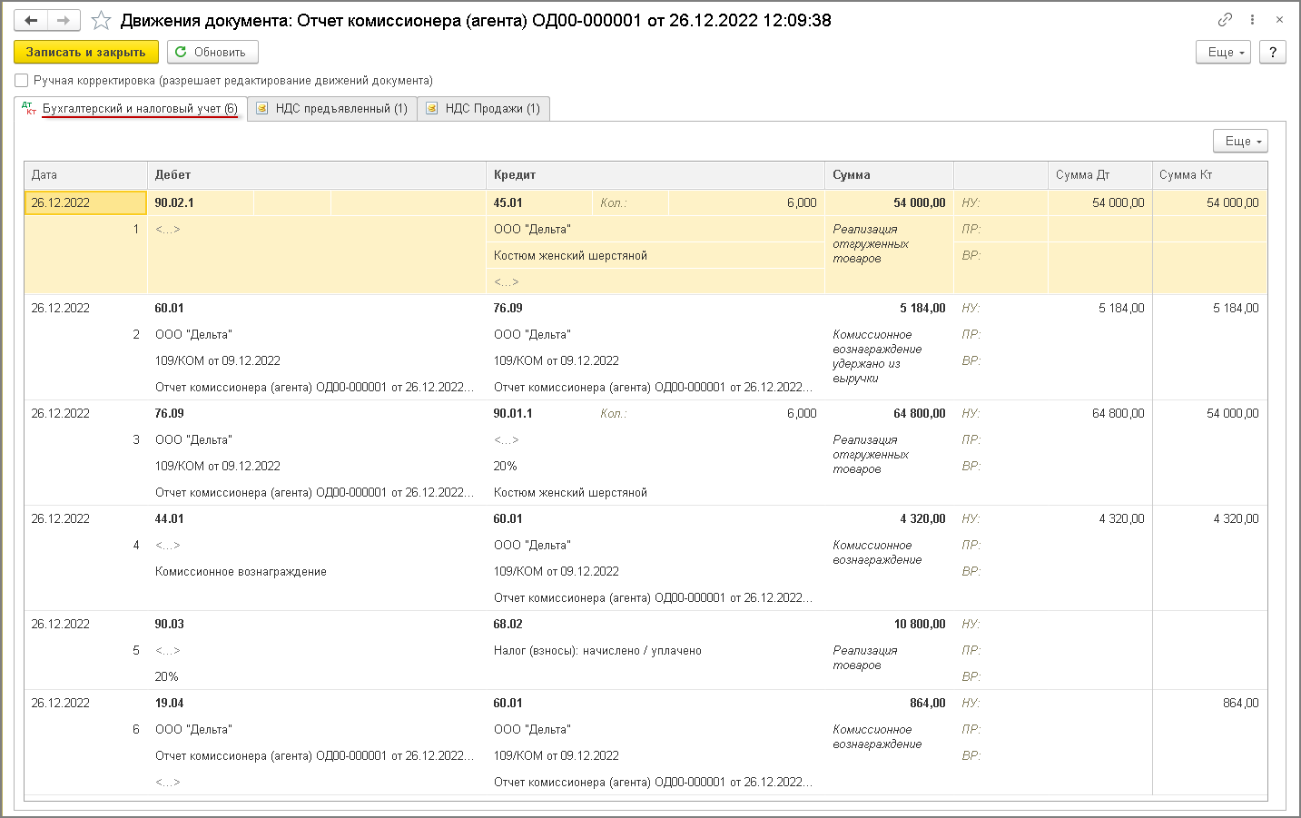 После проведения документа "Отчет комиссионера (агента) о продажах" в регистр бухгалтерии будут введены бухгалтерские записи (рис. 25):