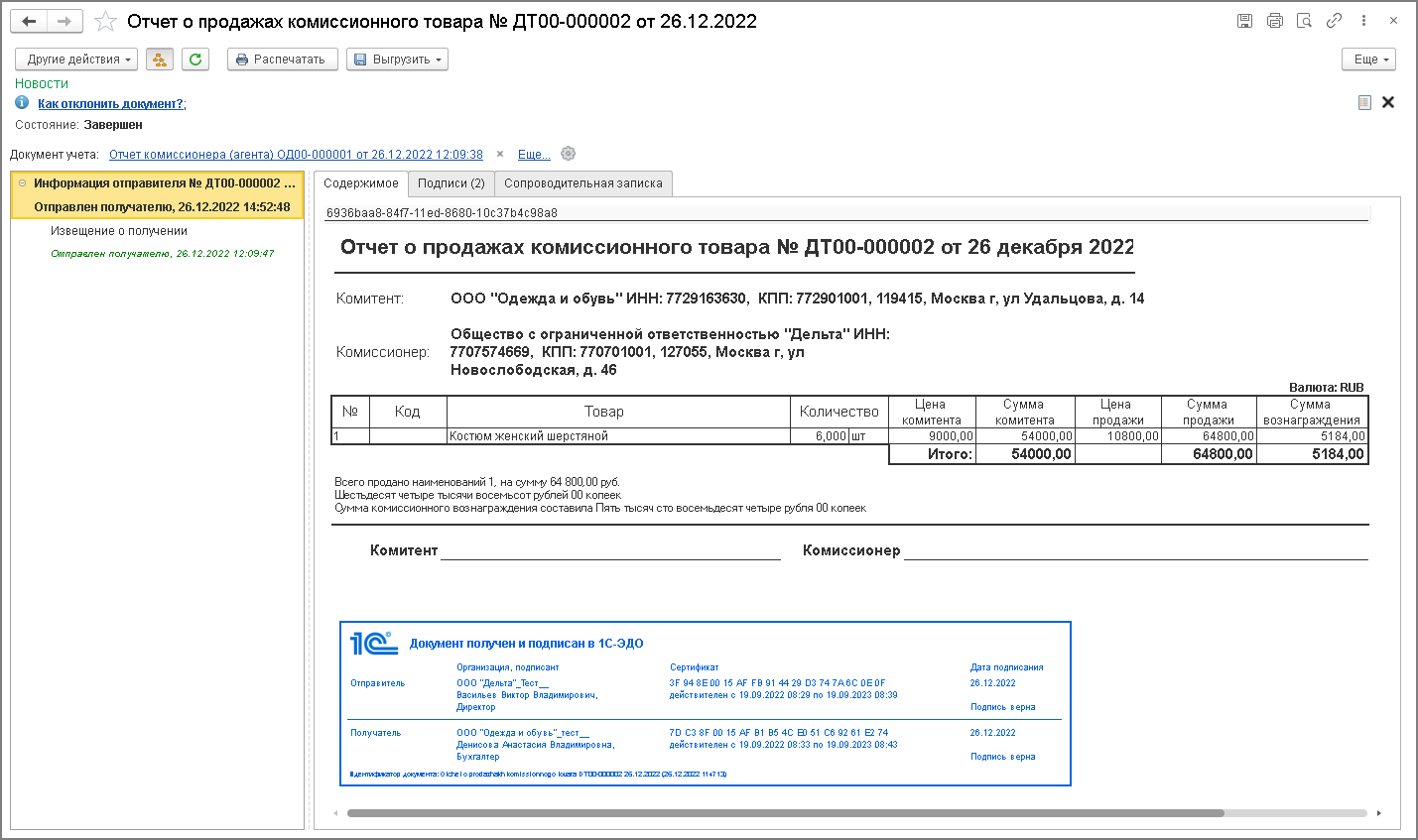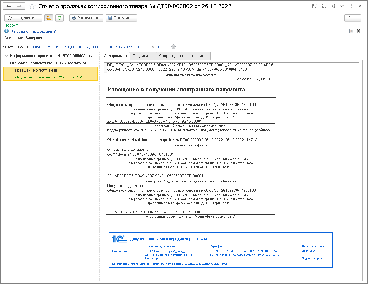 Также после получения электронного документа "Отчет о продажах комиссионного товара" будет автоматически сформировано извещение о его получении для отправки комисисонеру, которое также необходимо подписать и отправить (рис. 27).
