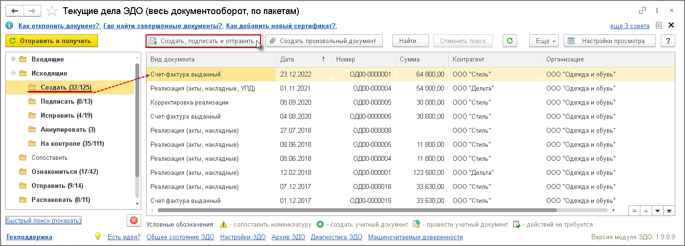 - выбрать в папке "Создать" списка документов "Текущие дела ЭДО" документ "Счет-фактура выданный" и выполнить команду Создать, подписать и отправить (рис. 30).