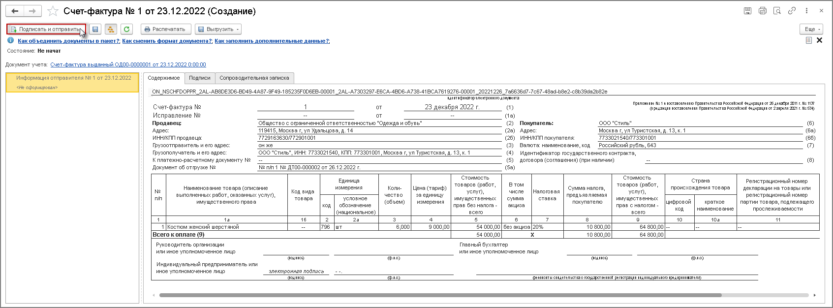 Из формы просмотра также можно выполнить подписание и отправку электронного счета-фактуры с помощью кнопки Подписать и отправить.