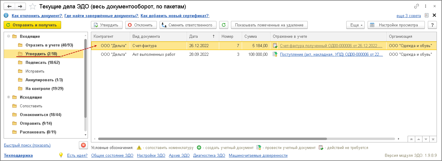 Поступивший электронный счет-фактура помещается в папку "Отразить в учете", а также в папку "Утвердить" списка "Текущие дела ЭДО" (рис. 33).