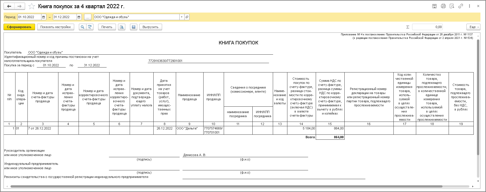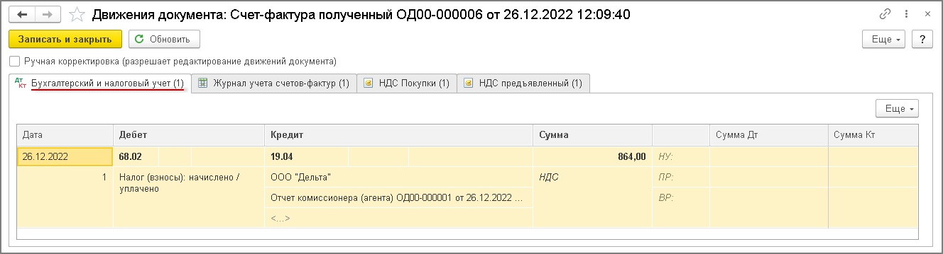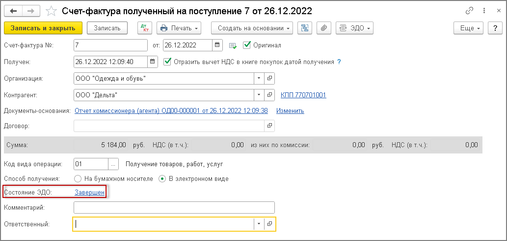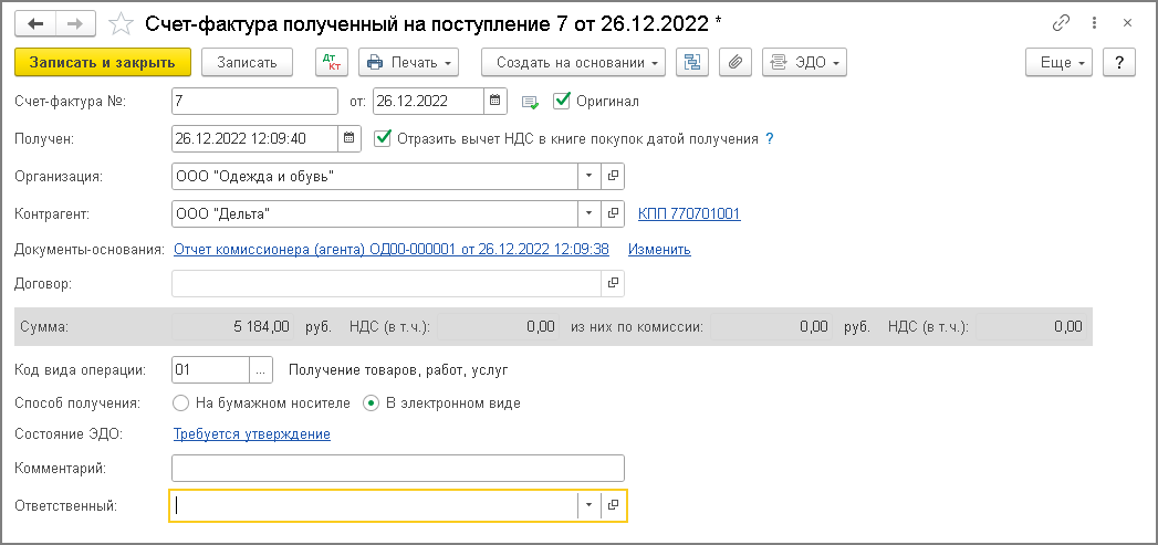 Таким образом, поступивший электронный счет-фактура на услугу комиссионера будет зарегистрирован в книге покупок за 4 квартал 2022 года (раздел Отчеты - подраздел НДС).