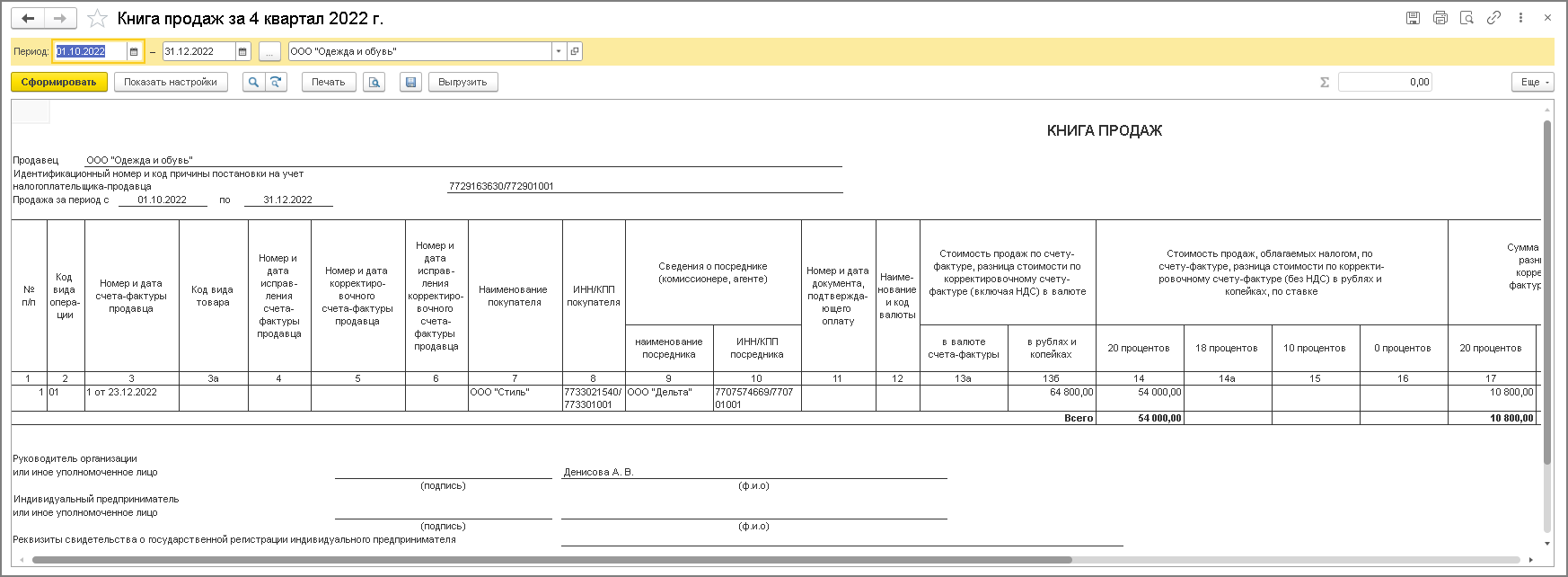 Перевыставленный комиссионеру счет-фактура № 1 от 23.12.2022 на стоимость товаров, реализованных комиссионером покупателю, будет зарегистрирован в книге продаж за 4 квартал 2022 года (рис. 39).