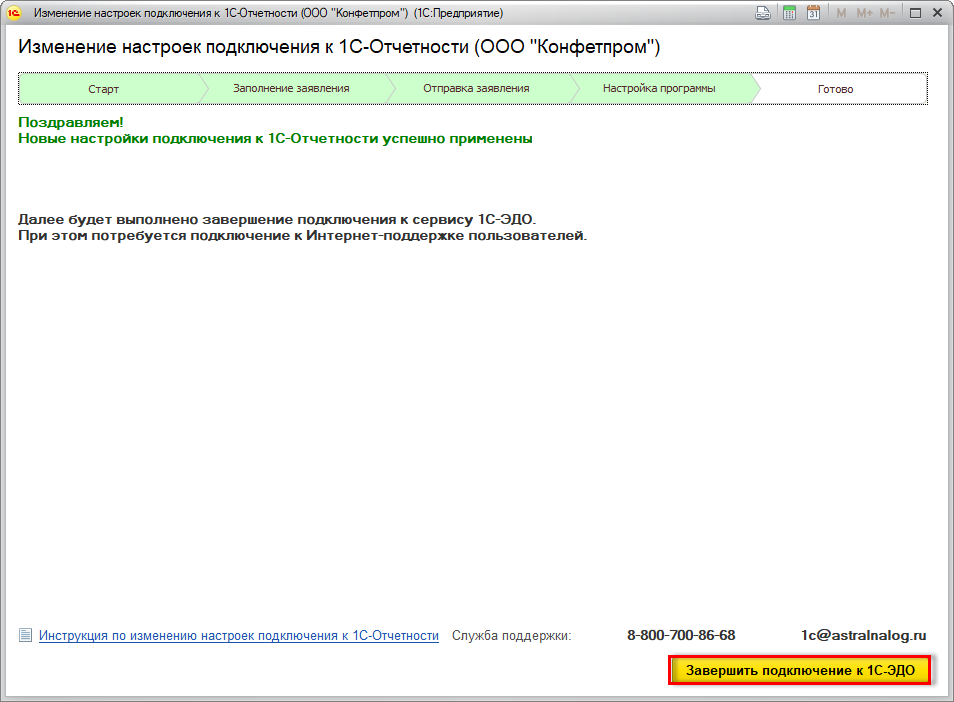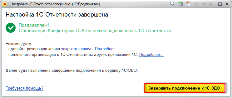 После одобрения заявления и завершения настроек "1С-Отчетности" автоматически откроется окно завершения настроек по "1С-ЭДО". В нем следует нажать Завершить подключение к 1С-ЭДО.