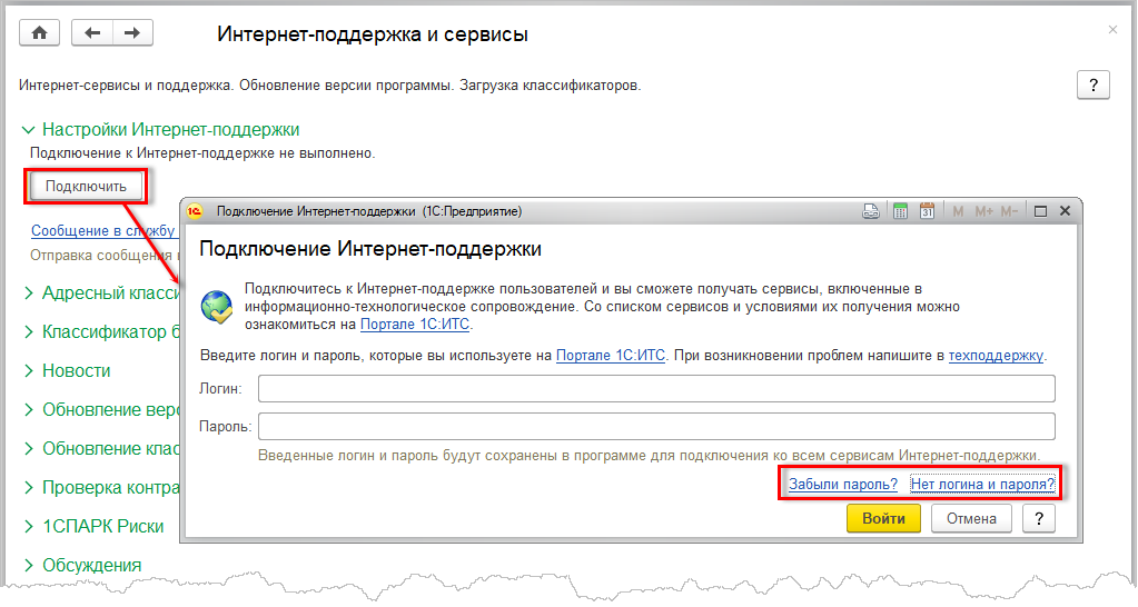 Примечание: логин и пароль можно запросить у организации, обслуживающей в рамках договора ИТС, или восстановить (получить) самостоятельно по ссылке Забыли пароль? (Нет логина и пароля?).