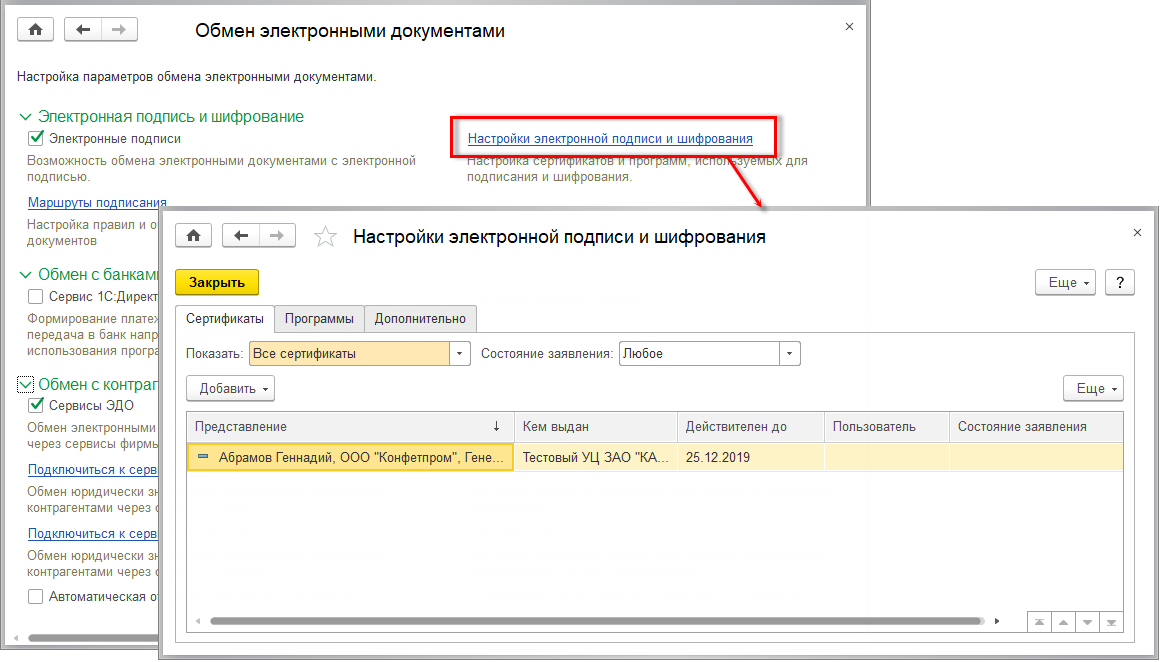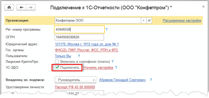 В результате подключения сервиса будут автоматически произведены первичные настройки электронного документооборота (раздел Администрирование – Настройки программы – Обмен электронными документами):