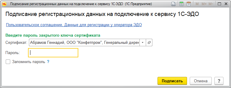 После нажатия кнопки Завершить подключение к 1С-ЭДО автоматически откроется окно, в котором следует ввести пароль от вновь созданного контейнера ключей и подписать данные, необходимые для регистрации в сервисе. При желании, чтобы не вводить пароль от контейнера повторно, можно установить флажок Запомнить пароль.