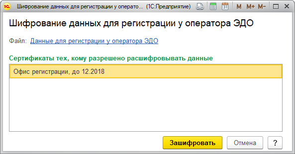В следующем окне отобразится сертификат офиса регистрации оператора ЭДО. В целях шифрования передаваемых данных следует нажать Зашифровать.