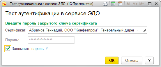 Откроется окно проверки доступа к "1С-ЭДО". Следует повторно ввести пароль от контейнера ключей.