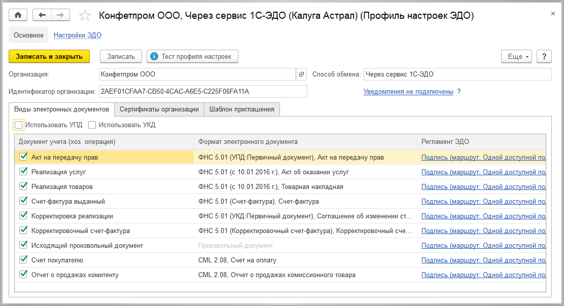 В случае успеха откроется автоматически созданный профиль настроек ЭДО.