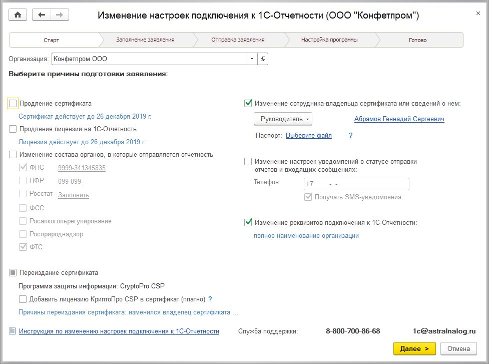 - Открыть форму подготовки заявления (рабочее место "1С-Отчетность" - Настройки – Отчетность в электронном виде – Заявление на продление 1С-Отчетности или изменение реквизитов), заполнить и нажать Далее.