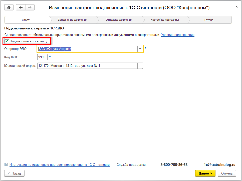 Такая возможность доступна из помощника подключения 1С-Отчетности, а также из помощника изменения настроек и продления.