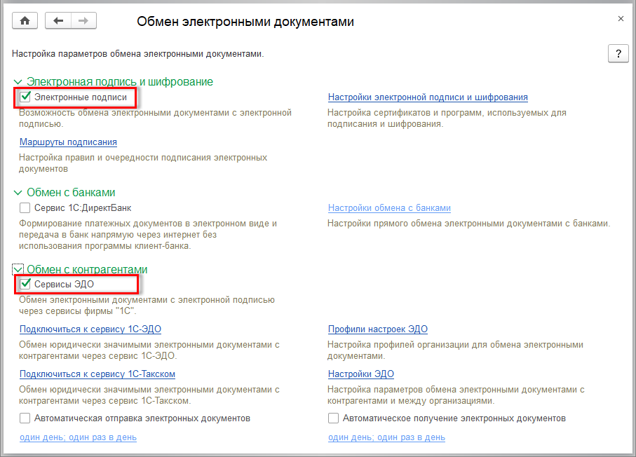 - установлены флажки Электронные подписи и Сервисы ЭДО,