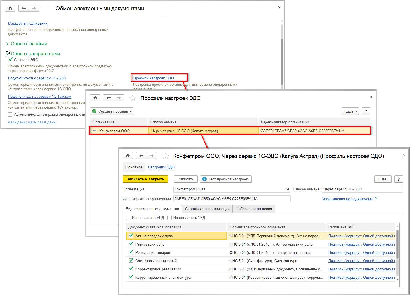 Подробнее о настройках 1С-ЭДО см. стр. 16-21 "Руководство Пользователя. Сервис 1С-ЭДО. На примере конфигурации "Бухгалтерия предприятия", редакция 3.0".