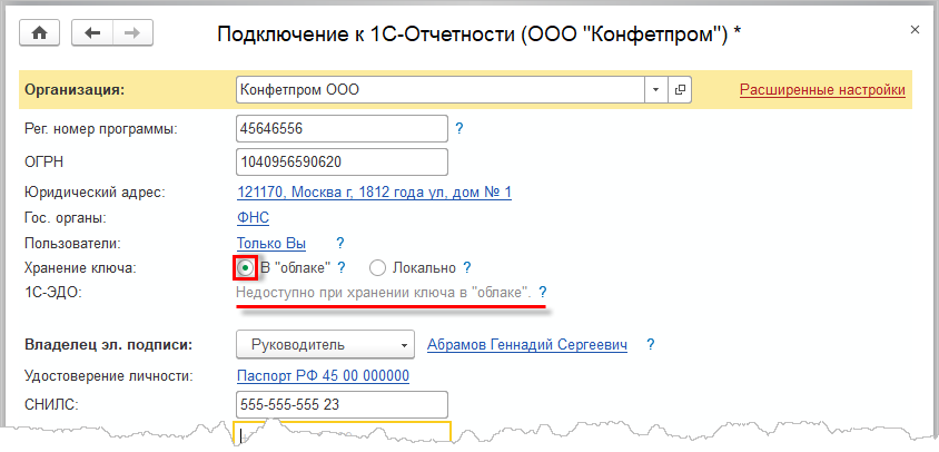 Подключение к "1С-ЭДО" доступно в "локальном" режиме работы "1С: Предприятия" (по локальной компьютерной сети или напрямую с компьютера пользователя) и в "облачном" (через интернет-браузер, например, на сайте 1cfresh.com, используя сервис "1С: Предприятие 8 через Интернет"), но при условии хранения ключа локально, на компьютере.