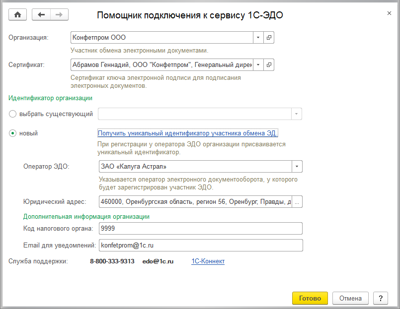 Если пользователь закрыл окно без завершения настроек подключения к "1С-ЭДО", то вернуться к ним можно с помощью команды Подключиться к сервису 1С-ЭДО (раздел Администрирование – Настройки программы – Обмен электронными документами, окно Обмен электронными документами — Обмен с контрагентами). В открывшемся окне помощника следует заполнить поля по смыслу, получить уникальный идентификатор обмена ЭД с помощью одноименной команды и нажать Готово.