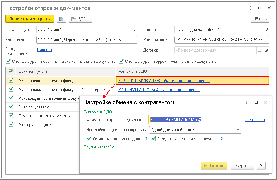 В графе "Регламент ЭДО" формы "Настройки отправки документов" следует уточнить применяемый порядок обмена электронным УПД (рис. 2):