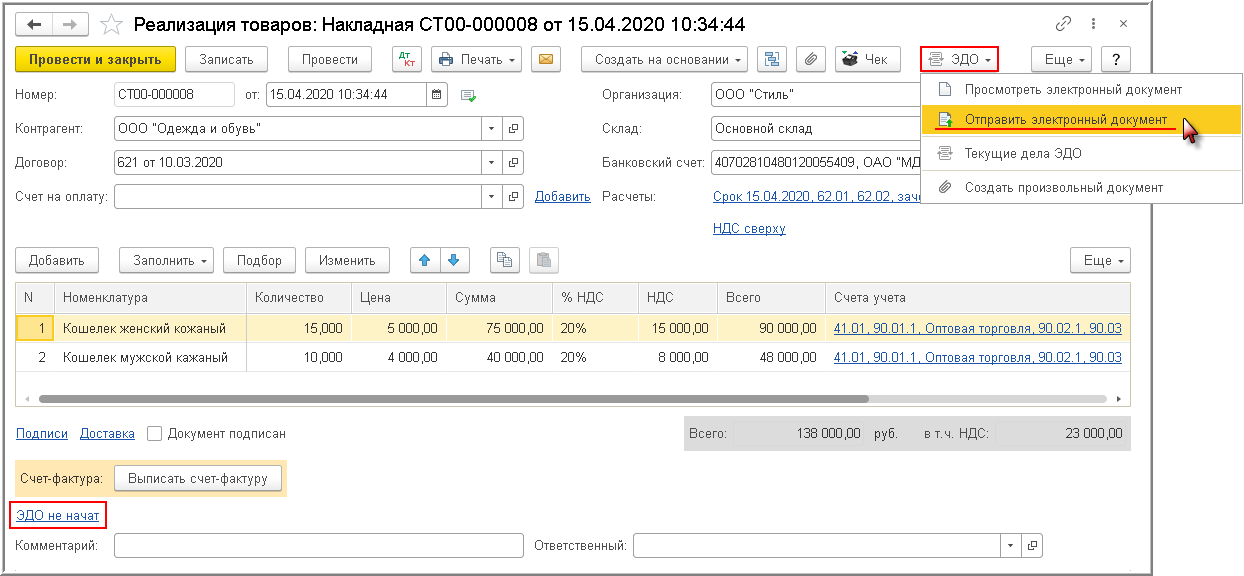 До начала формирования электронного УПД гиперссылка под табличной частью документа "Реализация (акт, накладная)" (рис. 3), отражающая текущее состояние обмена электронным УПД, будет содержать значение ЭДО не начат.