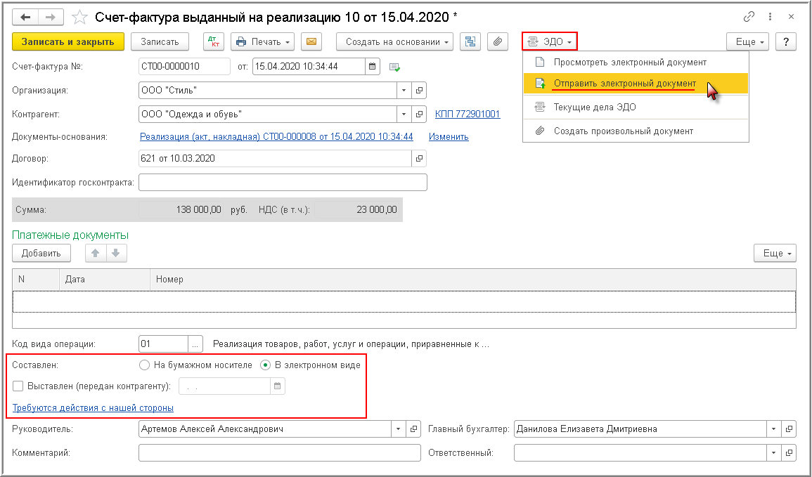 В документе "Счет-фактура выданный" (рис. 4), который формируется из документа "Реализация (акт, накладная)" по кнопке Выписать счет-фактуру (рис. 3), до момента формирования электронного УПД при наличии действующего соглашения с покупателем об обмене счетами-фактурами в электронной форме: