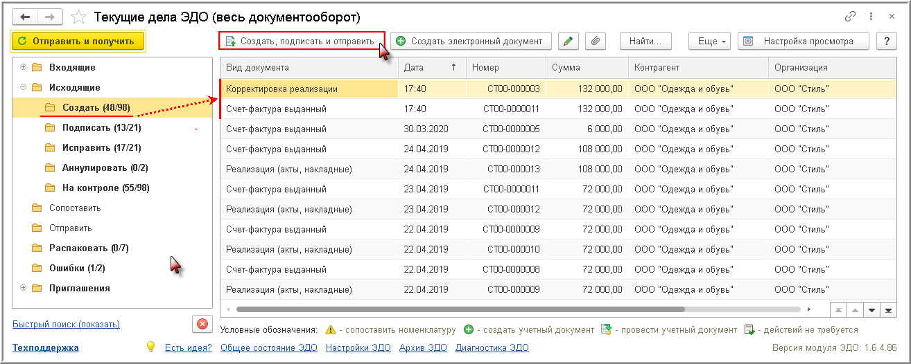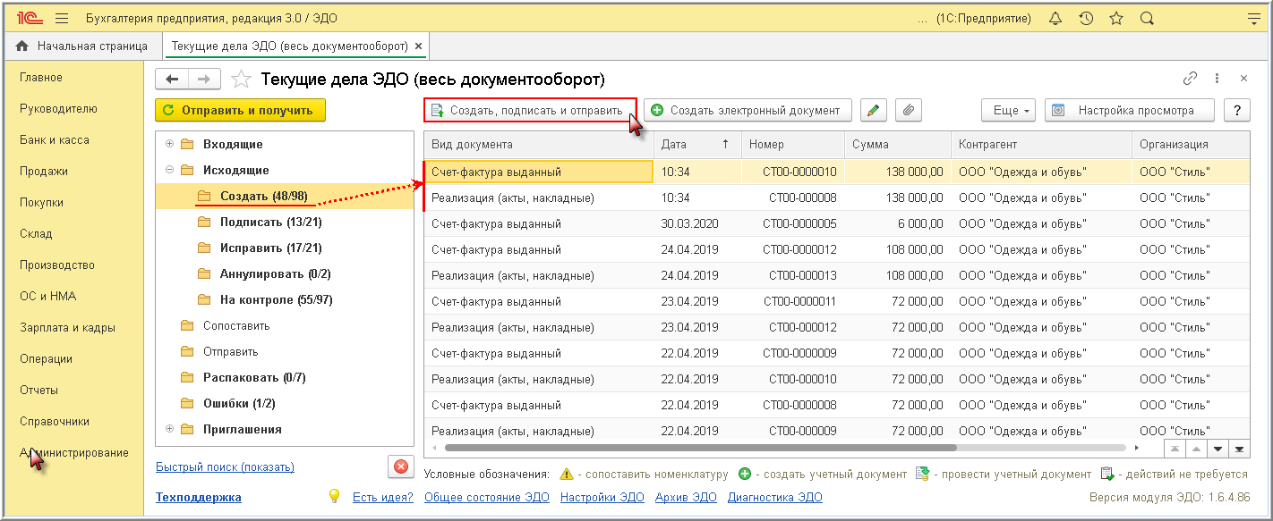 Если у текущего пользователя есть право подписи и сертификат подписи установлен на компьютере, то после выполнения команды Создать, подписать и отправить из списка "Текущие дела ЭДО" (рис. 5) программа отправит подписанный электронный документ контрагенту (или подготовит подписанный электронный УПД для отправки, если установлена отложенная отправка электронных документов, о чем будет написано далее).