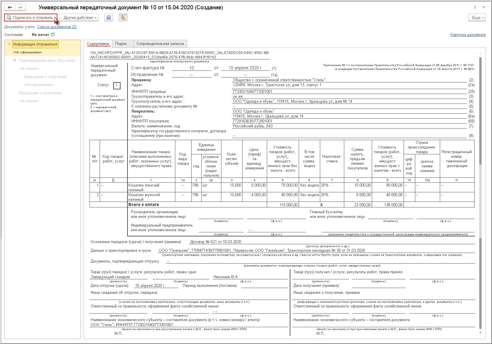 - флажок "Ожидать ответную подпись" устанавливается в том случае, если в соответствии с гражданским законодательством РФ требуется составление двустороннего документа, удостоверяющего приемку (при передаче товаров в рамках договора купли-продажи наличие флажка обязательно);