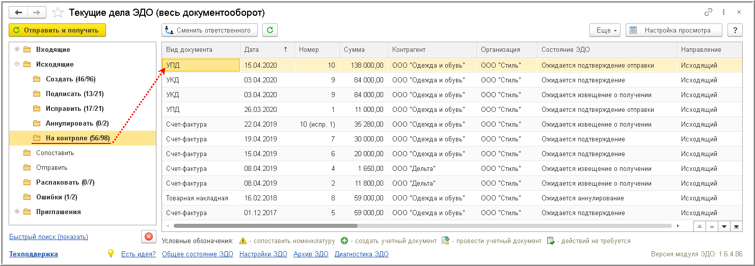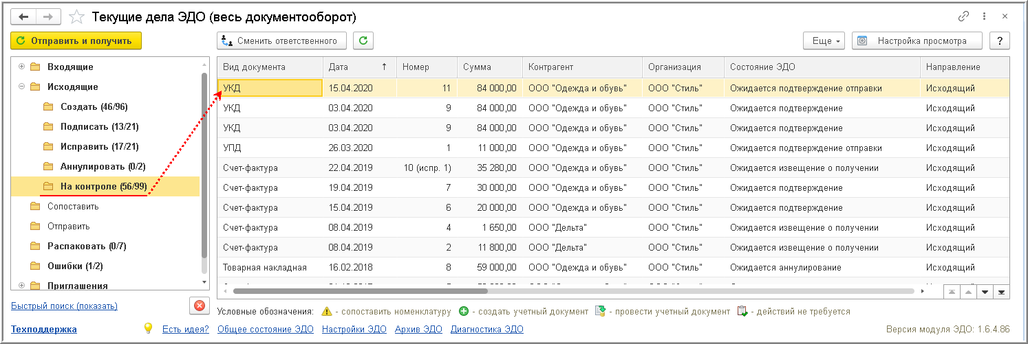 Отправленный УКД, в отношении которого ожидается получение подтверждения оператора ЭДО и информации покупателя, перекладывается в папку документов "На контроле" формы списка исходящий документов "Текущие дела ЭДО" (рис. 24).