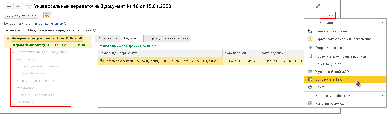 Из формы просмотра, вызвав команду Сохранить в файл из списка доступных команд, открываемого по кнопке Еще (рис. 8), можно сохранить электронный УПД вместе с электронной подписью.