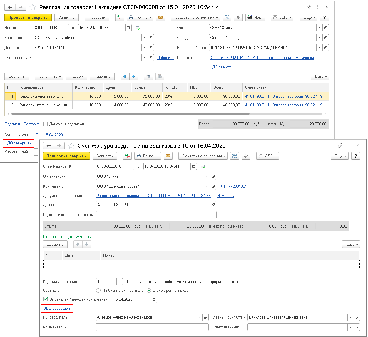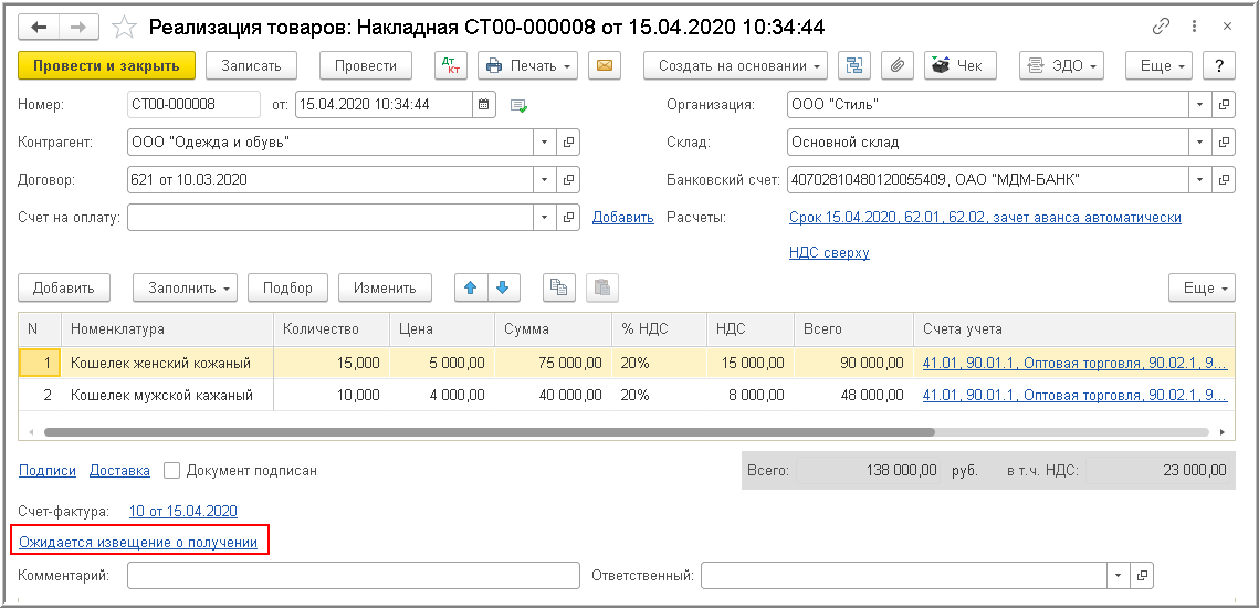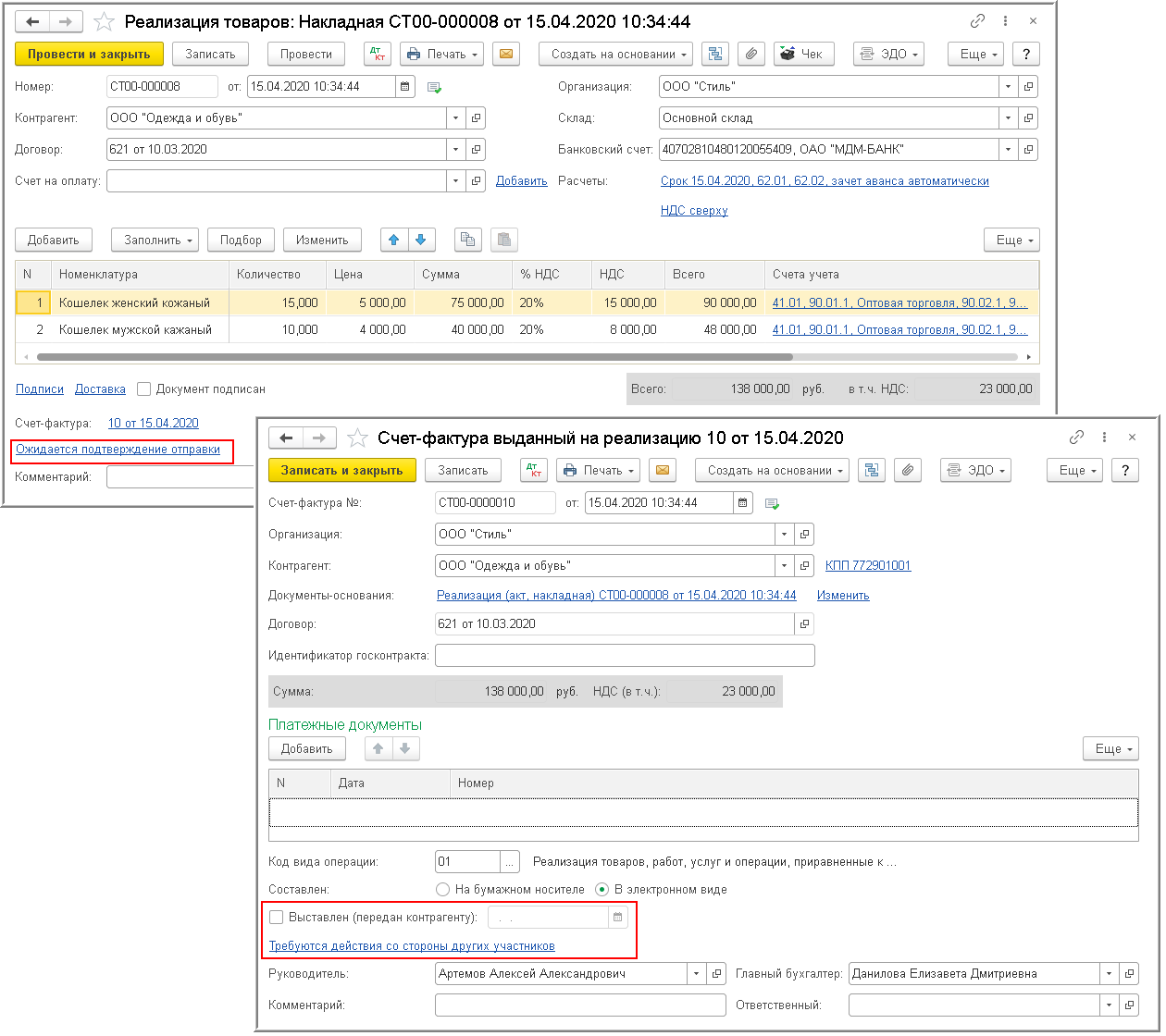 - в документе "Реализация (акт, накладная)" в строке состояния будет содержаться информация Ожидается подтверждение отправки;