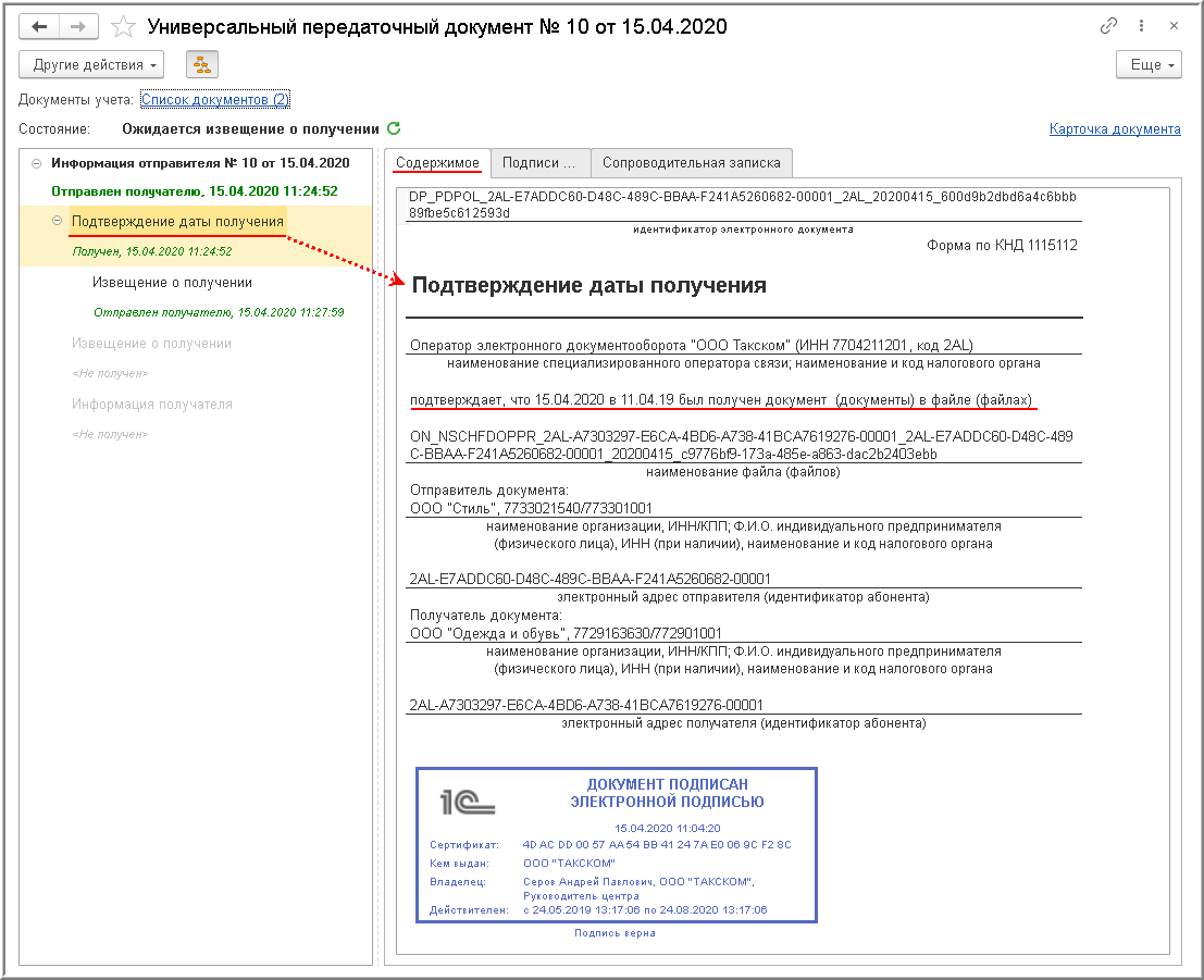 - от оператора ЭДО - подтверждение с указанием даты и времени поступления ему файла УПД;