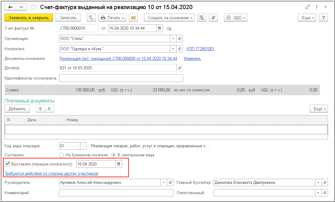 - в документе "Счет-фактура выданный" будут отсутствовать флажок и дата выставления в строке "Выставлен (передан контрагенту)", а в информационной строке будет указано, что Требуются действия со стороны других участников.