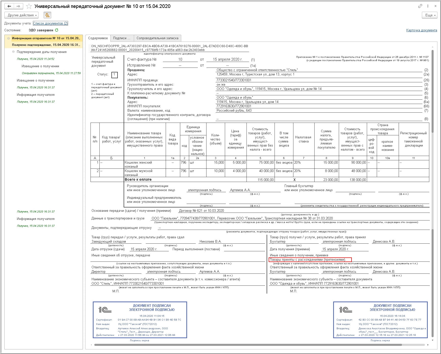 В форме просмотра электронного УКД можно удостовериться, что документ подписан обеими сторонами сделки, а также в том, что все необходимые служебные документы, сопровождающие обмен электронным УКД, получены и отправлены (рис. 30).
