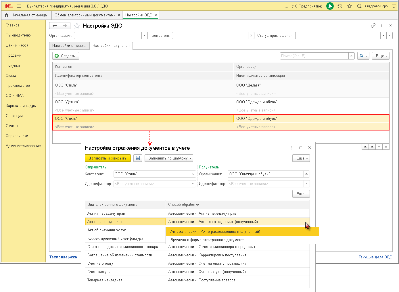 Отражение поступающих электронных документов в учетной системе продавца зависит от настройки ЭДО (раздел Администрирование - Обмен электронными документами - Обмен с контрагентами - Настройки ЭДО). При взаимодействии с конкретным контрагентом на закладке "Настройки получения" в форме "Настройка отражения документов в учете" можно установить способ обработки поступающих электронных документов: "Автоматически" или "Вручную в форме электронного документа" (рис. 15).
