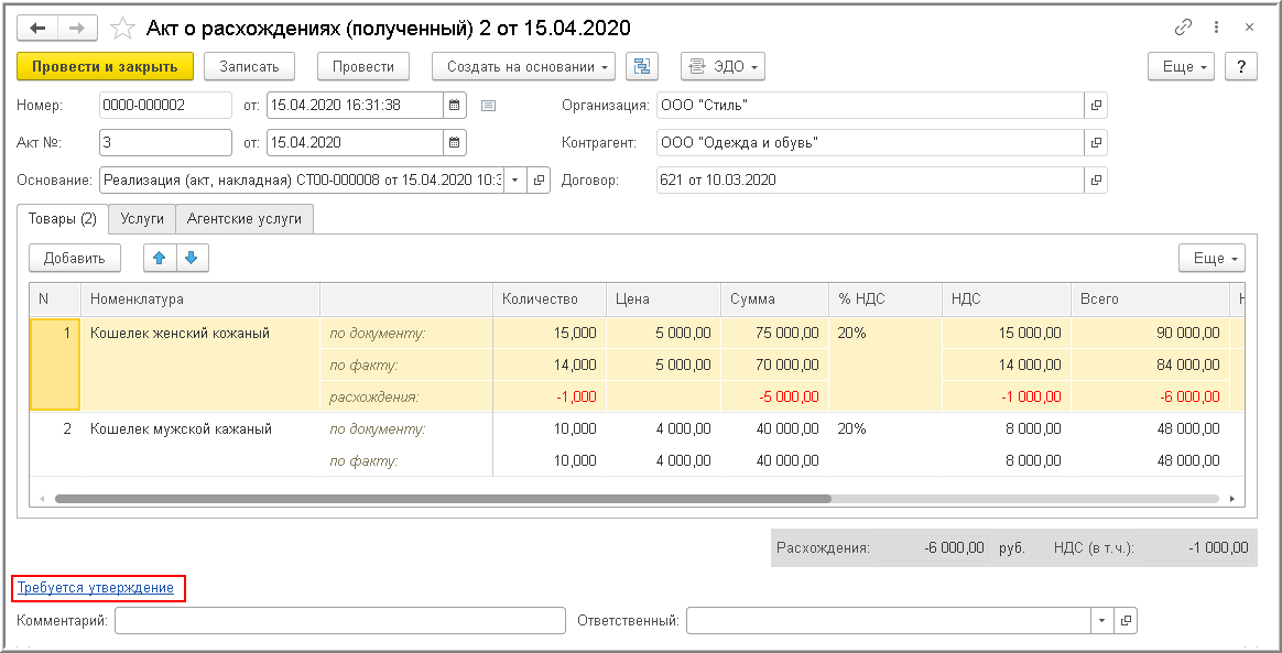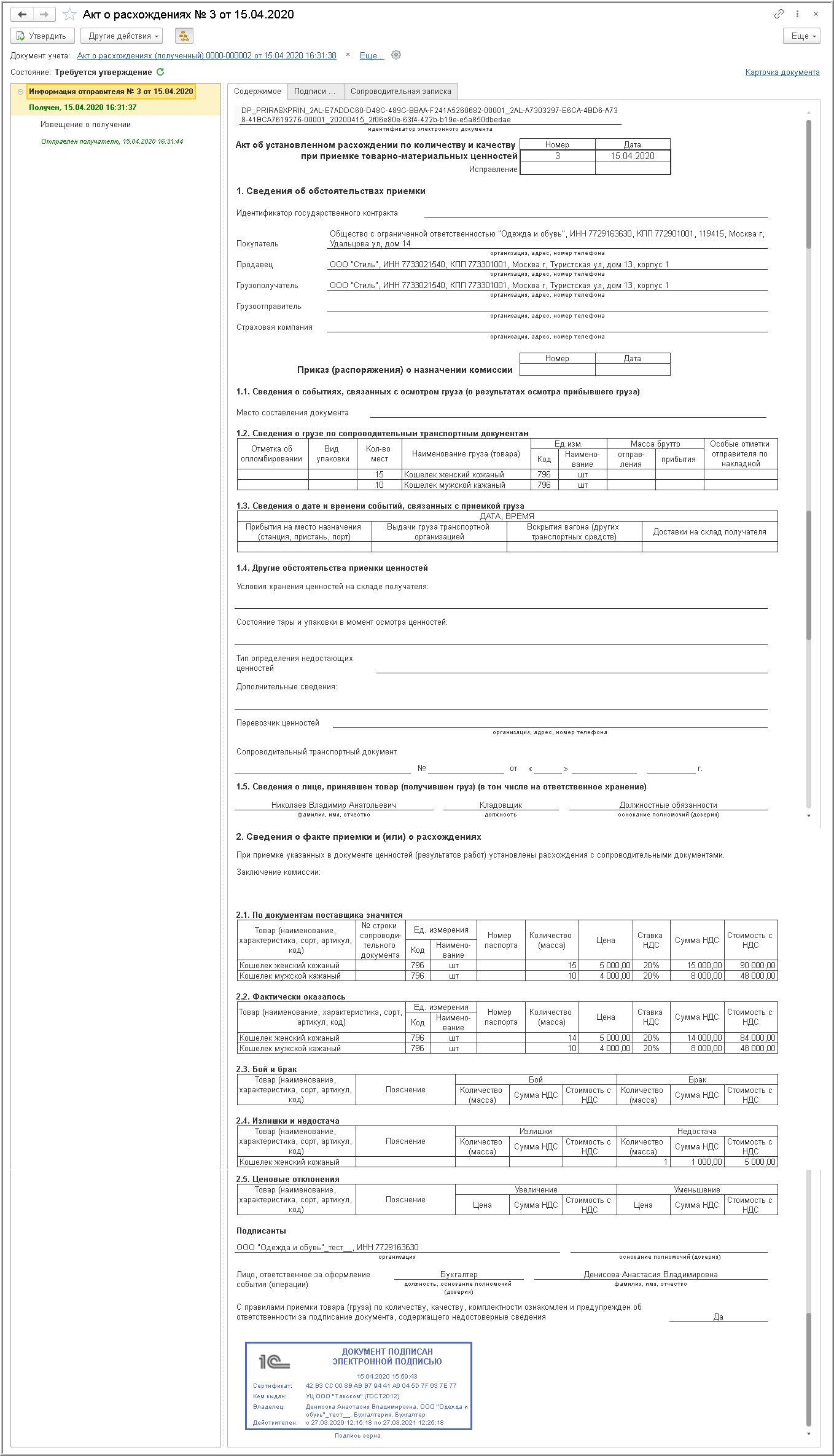 Поступивший электронный документ "Акт о расхождениях" необходимо утвердить, о чем свидетельствует запись в информационной строке состояния электронного обмена документа "Акт о расхождениях (полученный)", где будет отражено значение Требуется утверждение (рис. 18).