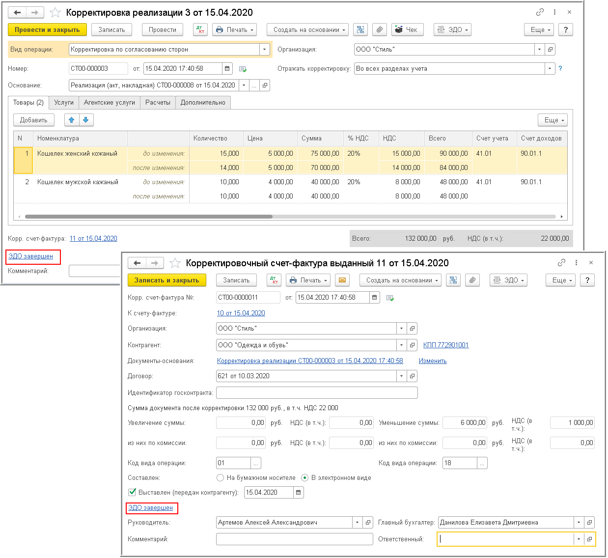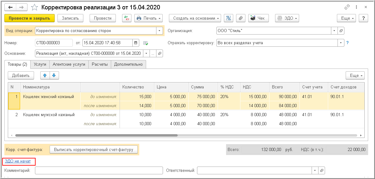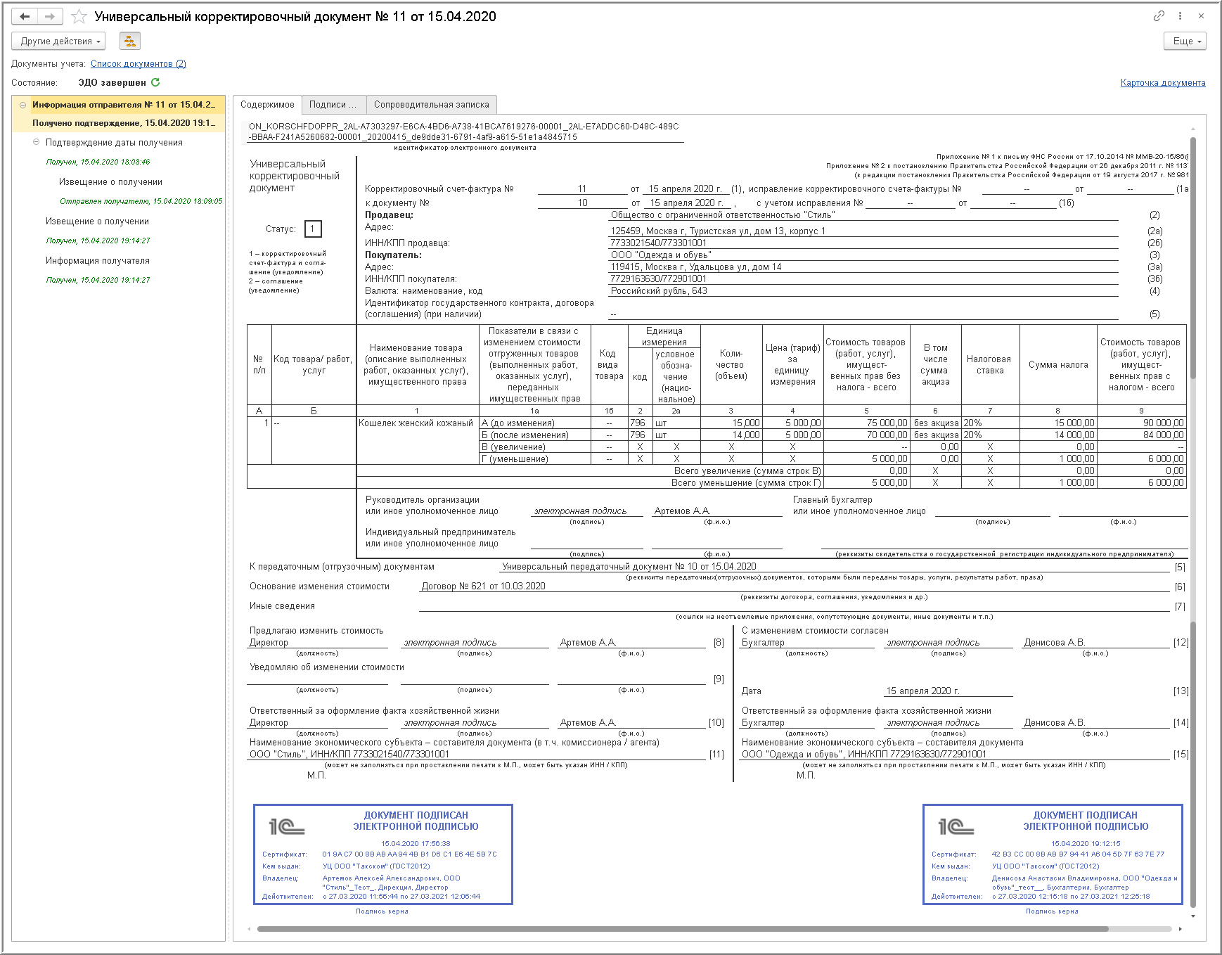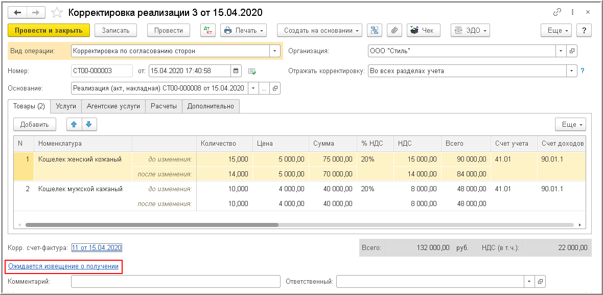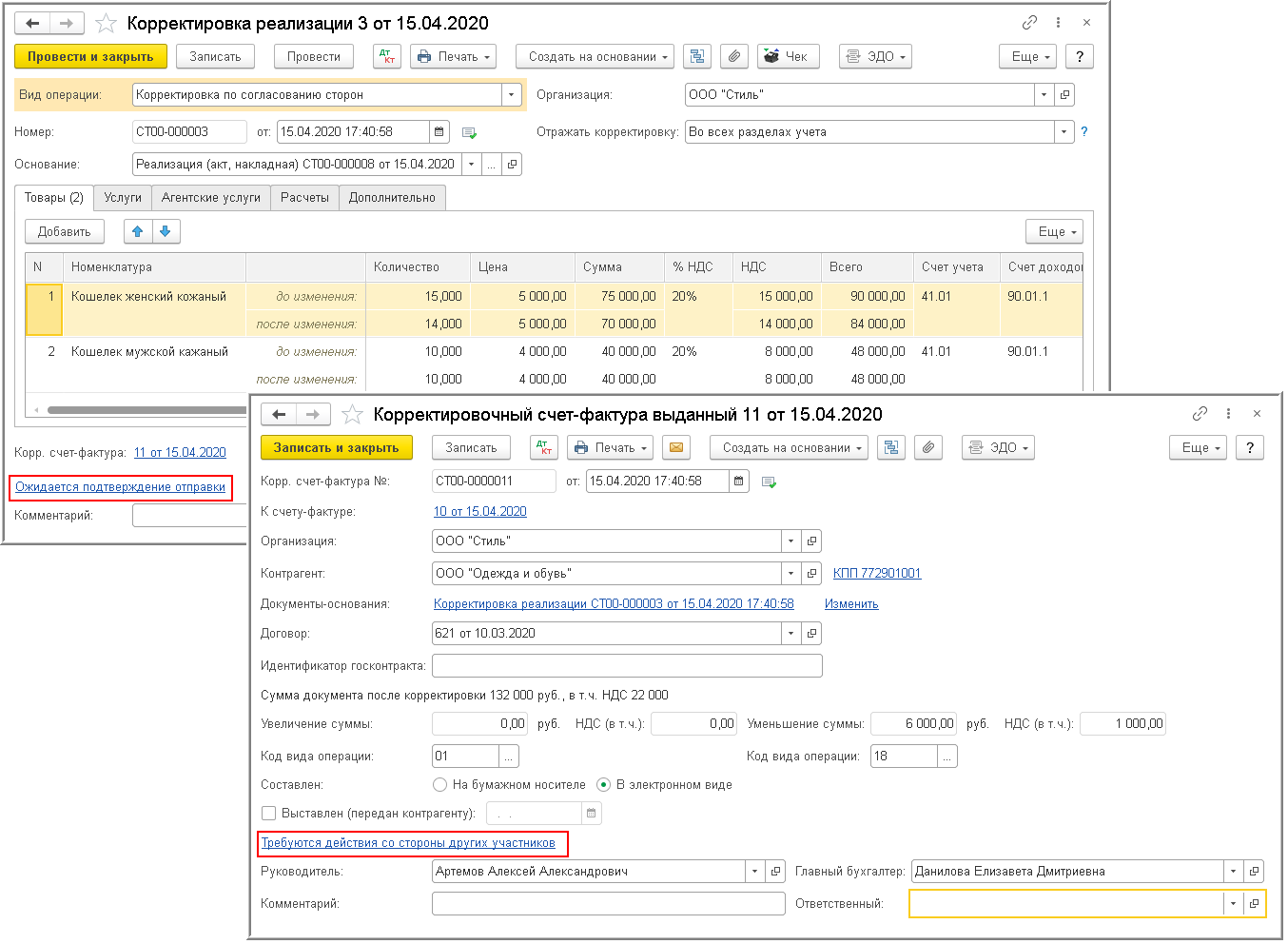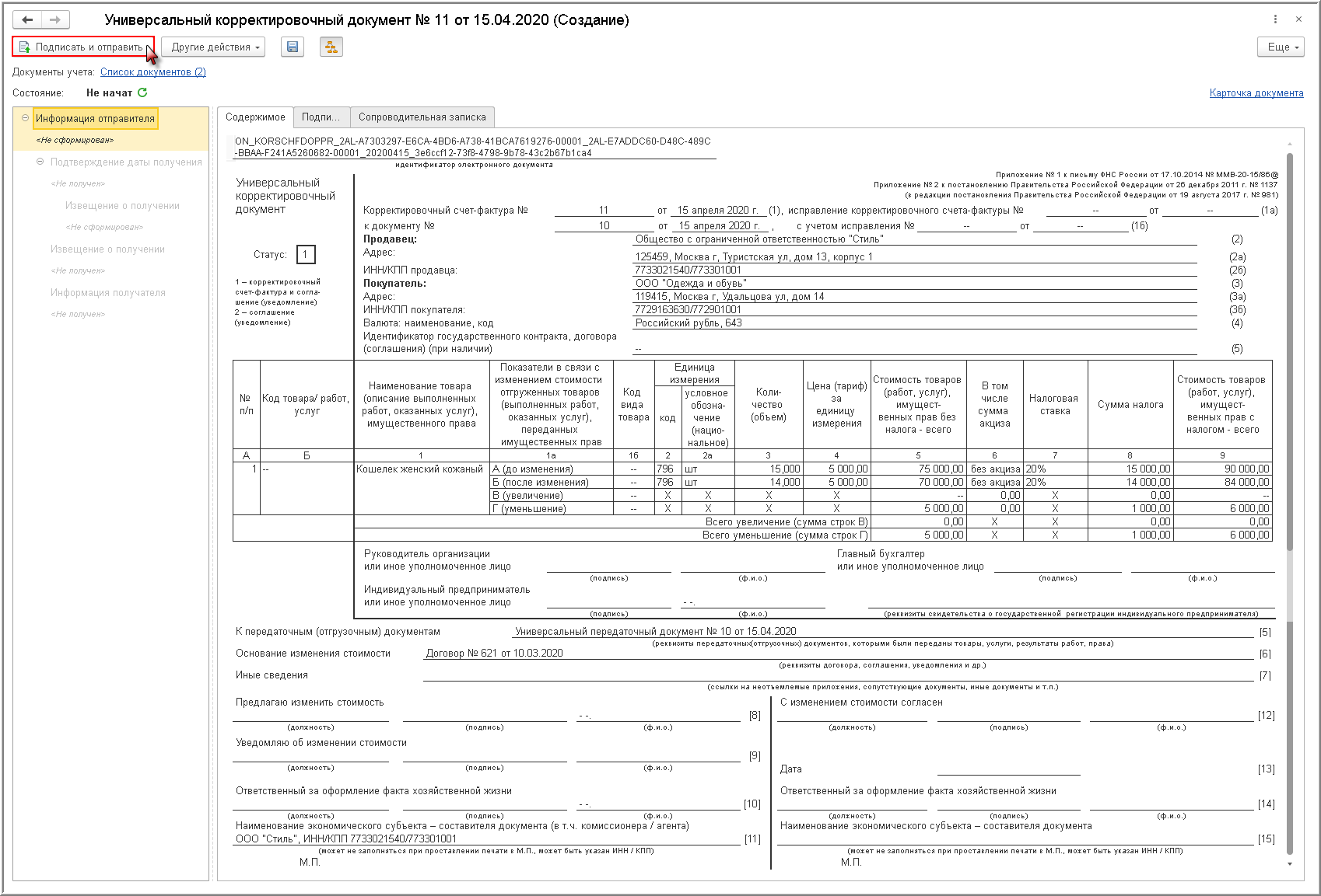 - в документе "Корректировка реализации" в строке состояния будет содержаться информация Ожидается подтверждение отправки;