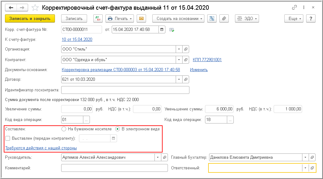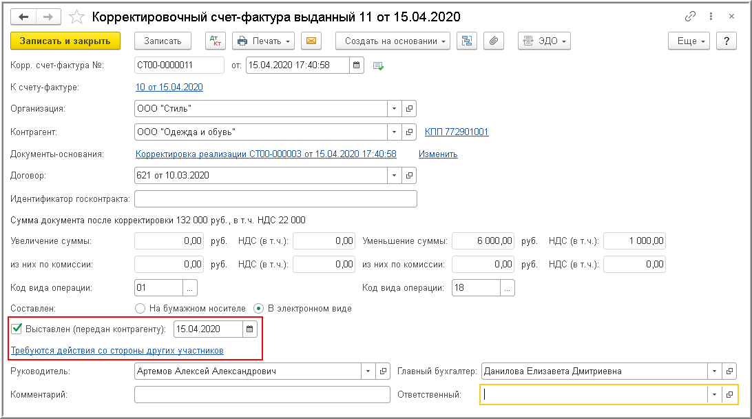 - в документе "Корректировочный счет-фактура выданный" будут отсутствовать флажок и дата выставления в строке "Выставлен (передан контрагенту)", а в информационной строке будет указано, что Требуются действия со стороны других участников.