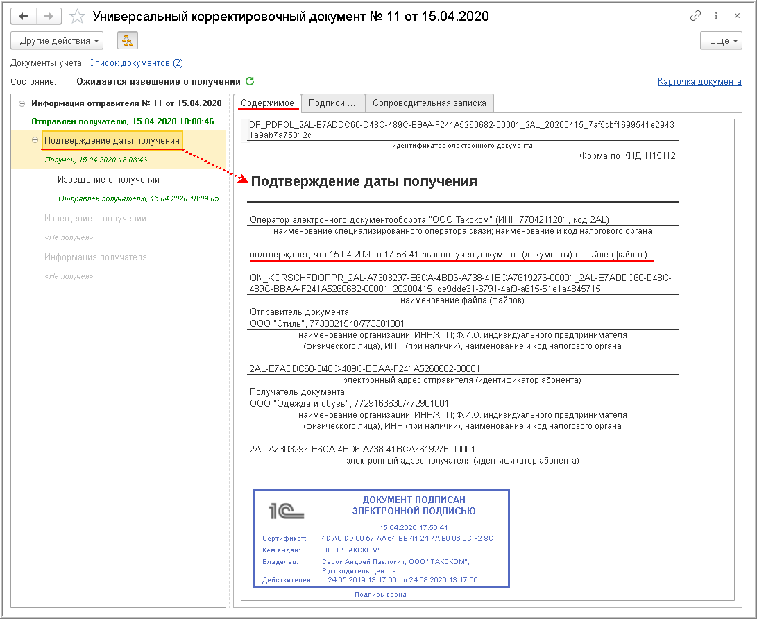 - от оператора ЭДО - подтверждение с указанием даты и времени поступления ему файла УКД;
