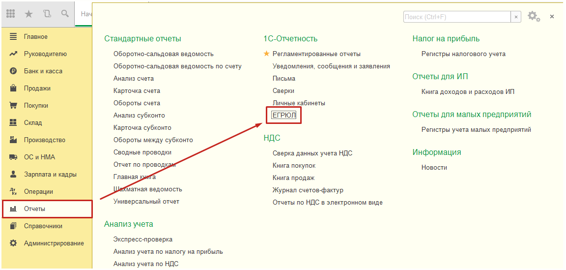 Для получения выписки из Единого Государственного реестра юридических лиц и индивидуальных предпринимателей перейдите в пункт меню «Отчеты» → «ЕГРЮЛ»: