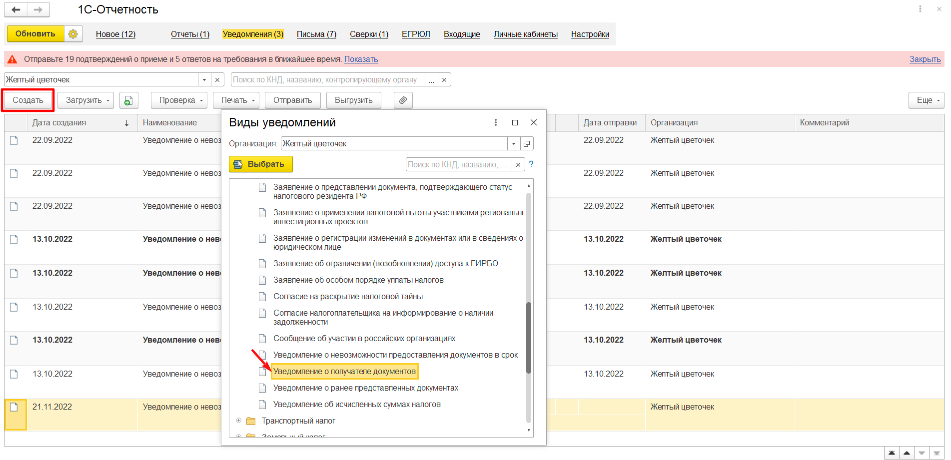 Для отправки Уведомления перейдите на закладку Уведомления в окне "1С-Отчетность", нажмите кнопку Создать и выберите Уведомление о получателе документов из папки Налоговый контроль (рис. 1).