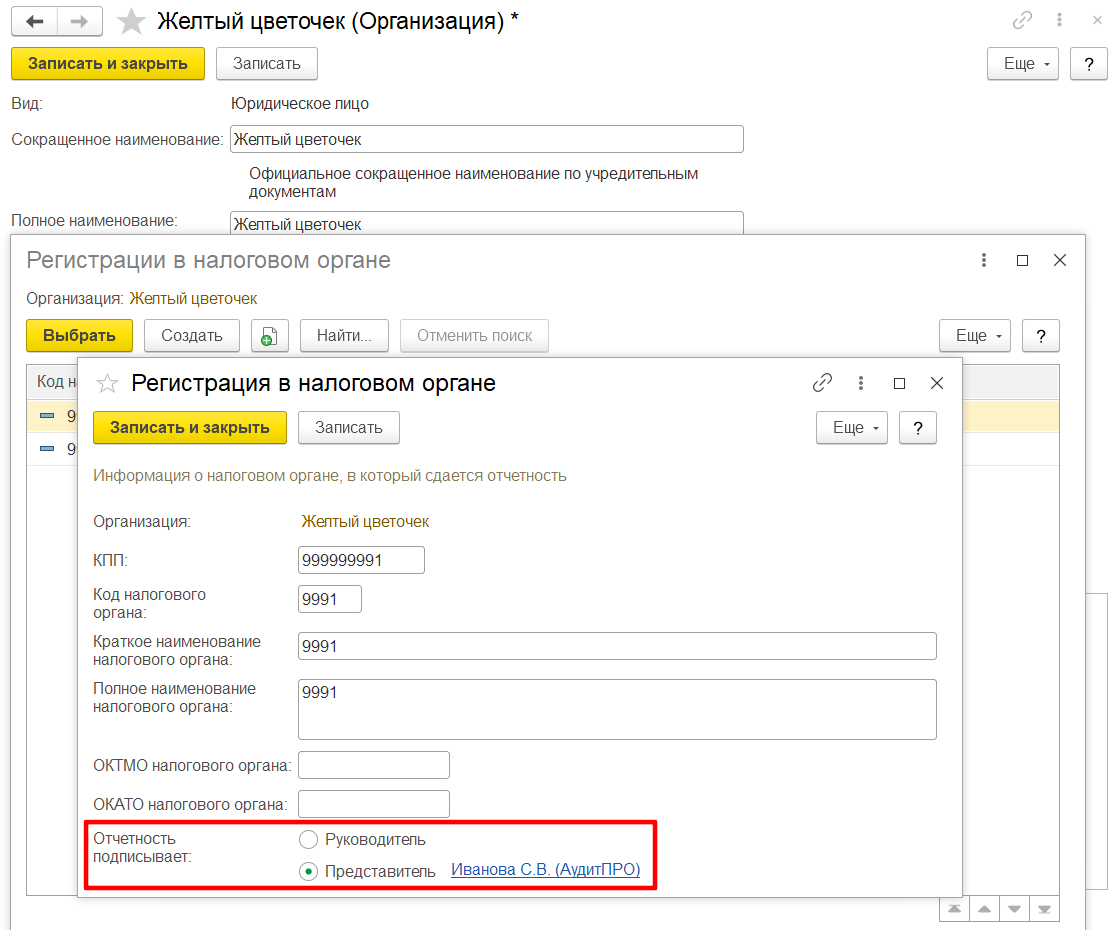 При открытии формы уведомления, данные в форме заполняются значениями по умолчанию из элемента справочника Организации. Если в элементе Организации определено, что отчетность представляет организация-уполномоченный представитель (рис. 3), то по умолчанию подставляются данные уполномоченного представителя.