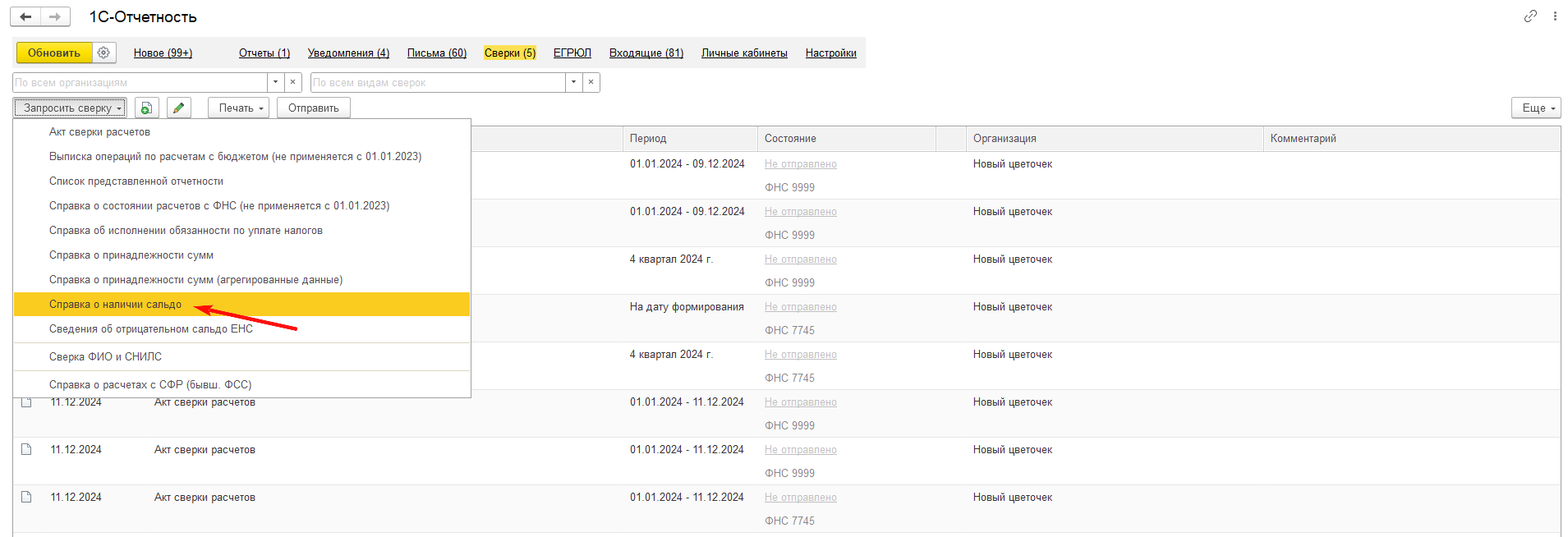 Для запроса справки перейдите в раздел Сверки формы 1С-Отчетность и нажмите кнопку Запросить сверку. В открывшемся списке выберите Справка наличии сальдо (рис. 1).