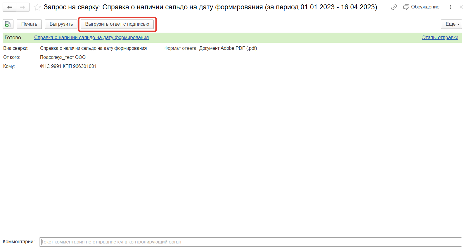 При необходимости вы можете выгрузить ответ ИФНС с подписью. Для этого используйте кнопку Выгрузить ответ с подписью на панели формы (рис.6).