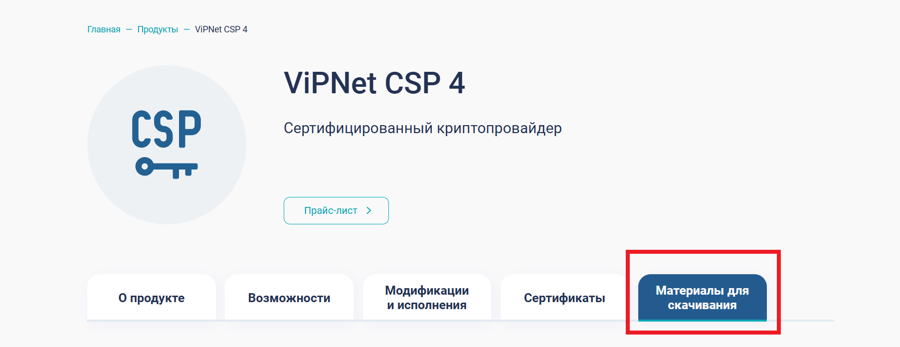 - Скачайте дистрибутив, для этого перейдите на станицу продукта ViPNet CSP и откройте вкладку «Материалы для скачивания» (рис. 3).