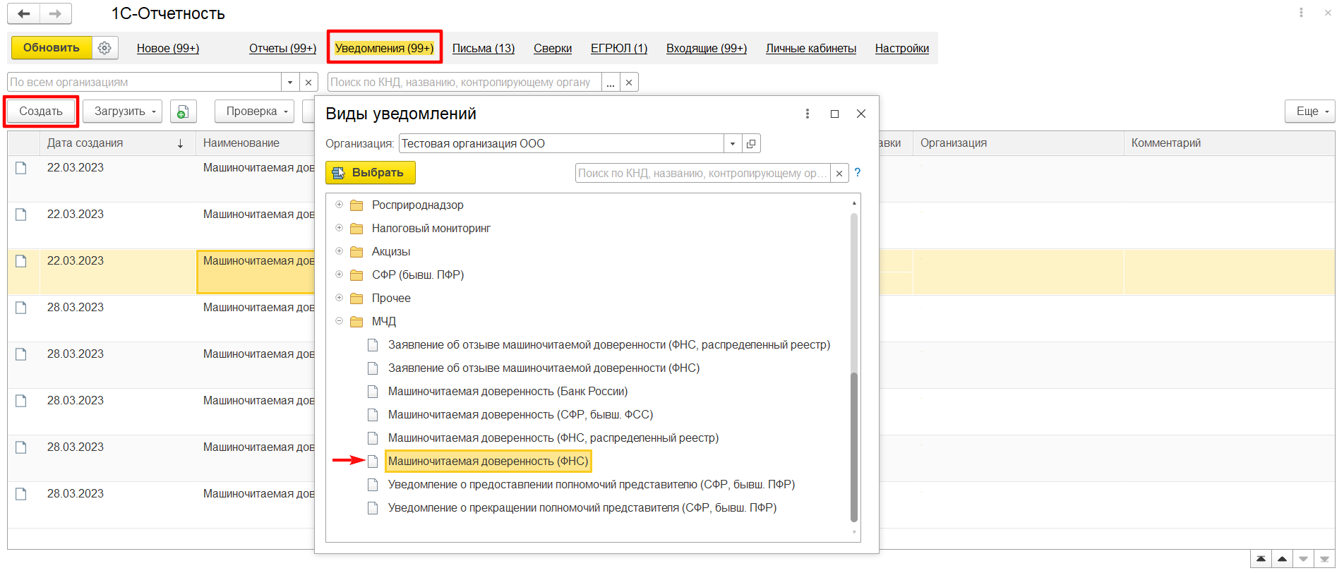 Для создания МЧД нажмите кнопку Создать в разделе Уведомления сервиса 1С-Отчетность и выберите Машиночитаемая доверенность (ФНС) (рис.1).